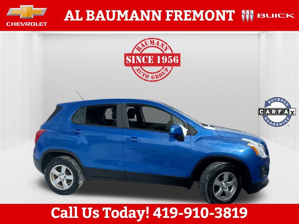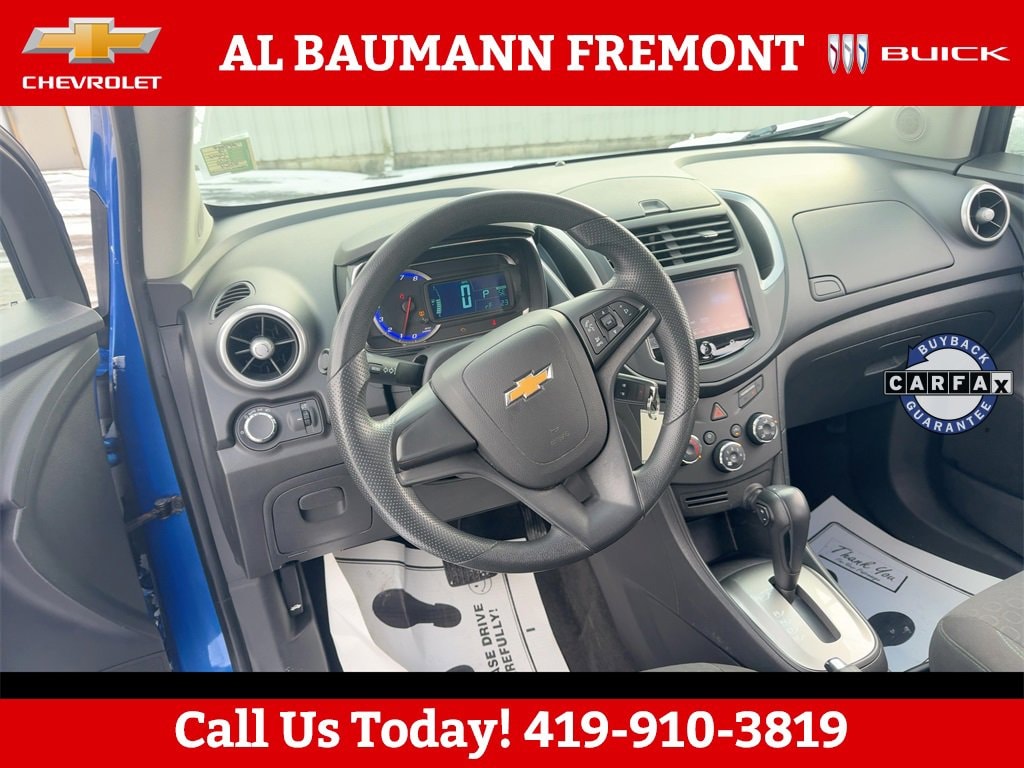 Odometer is 35621 miles below market average!Black Granite Metallic 2015 Chevrolet Trax LS AWD 4D Sport Utility ECOTEC 1.4L I4 SMPI DOHC Turbocharged VVT 6-Speed Automatic AWDONLY TWO OWNERS.Car shopping is sometimes inconvenient and stressful, and we want to take the hassle out of this all-too-common experience. If youâre interested in more convenience, less frustration and a process that works efficiently to meet your needs as a customer. Al BAUMANN AUTO GROUP. The Best Price Up Front Cash Offers For Any Trade-In Multiple Financing Quotes In Minutes A Team Of Dedicated Salespeople.CALL,419-332-8236 or {1-866-330-3601}, Front & Rear All Weather Floor Mats (LPO), Front & Rear Custom Molded Splash Guards, Protection Package, 16 Painted Aluminum Wheels, 2-Way Manual Front Passenger Seat Adjuster, 3.53 Final Drive Axle Ratio, 4-Wheel Disc Brakes, 6 Speakers, ABS brakes, Air Conditioning, Alloy wheels, AM/FM radio, Brake assist, Bumpers: body-color, Cloth Seat Trim, Compass, Delay-off headlights, Driver door bin, Driver vanity mirror, Driver's Seat Mounted Armrest, Dual front impact airbags, Dual front side impact airbags, Electronic Stability Control, Emergency communication system: OnStar Directions & Connections, Exterior Parking Camera Rear, Front & Rear Color-Keyed Carpeted Floormats, Front anti-roll bar, Front Bucket Seats, Front Bucket Seats w/Driver Power Lumbar, Front License Plate Bracket, Front reading lights, Front wheel independent suspension, Fully automatic headlights, Illuminated entry, Knee airbag, Low tire pressure warning, Occupant sensing airbag, Outside temperature display, Overhead airbag, Panic alarm, Passenger door bin, Passenger vanity mirror, Power door mirrors, Power steering, Power windows, Premium audio system: Chevrolet MyLink, Radio data system, Radio: Chevrolet MyLink AM/FM Stereo, Rear seat center armrest, Rear side impact airbag, Rear window defroster, Rear window wiper, Remote keyless entry, Security system, Speed-sensing steering, Split folding rear seat, Spoiler, Steering wheel mounted audio controls, Tachometer, Telescoping steering wheel, Tilt steering wheel, Traction control, Trip computer, Variably intermittent wipers, Front & Rear All Weather Floor Mats (LPO), Front & Rear Custom Molded Splash Guards, Protection Package.