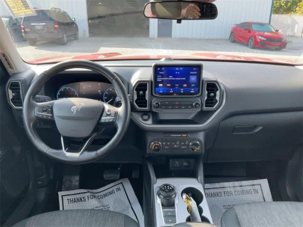 Odometer is 4091 miles below market average! CARFAX One-Owner. Hot Pepper Red Tinted Clearcoat 2022 Ford Bronco Sport Big Bend 1.5L EcoBoost 4D Sport Utility 8-Speed Automatic 4WD We are open and ready to serve you! Shop safely and conveniently from the comfort of your home. Contact us today to schedule your home delivery ! Baumann Ford Oregon Toledo Ohio Perrysburg Bowling Green Rossford Curtice Oak Harbor Woodville Monroe Michigan Temperance Erie Repair Facility Body Shop Collision Center Parts Service New Used Leasing Low Payment Low Payments Ford Motorcars Automobile Auto Cars Trucks SUV Sales. ONE OWNER, BLUETOOTH/HANDS FREE CELL PHONE, REAR BACK UP CAMERA, LOCAL TRADE, NON-SMOKER, FULLY DETAILED, REMAINDER OF FACTORY WARRANTY AVAILABLE, FRESH OIL CHANGE, Convenience Package, Equipment Group 200A, Front Driver & Passenger Seatback Zipper Pockets, Heated Front Bucket Seats, Intelligent Access (Lock/Unlock), Leather-Wrapped Steering Wheel, LED Fog Lamps, Rear Parking Sensors, Universal Garage Door Opener (UGDO), Wireless Charging Pad, 3.80 Axle Ratio, 4-Wheel Disc Brakes, 6 Speakers, ABS brakes, Air Conditioning, Alloy wheels, AM/FM radio: SiriusXM, AM/FM Stereo, Auto High-beam Headlights, Automatic temperature control, Brake assist, Compass, Delay-off headlights, Driver door bin, Driver vanity mirror, Dual front impact airbags, Dual front side impact airbags, Electronic Stability Control, Emergency communication system: SYNC 3 911 Assist, Four wheel independent suspension, Front & Rear Floor Liners, Front anti-roll bar, Front Bucket Seats, Front Center Armrest, Front reading lights, Fully automatic headlights, Heated door mirrors, Illuminated entry, Knee airbag, Low tire pressure warning, Occupant sensing airbag, Outside temperature display, Overhead airbag, Overhead console, Panic alarm, Passenger door bin, Passenger vanity mirror, Power door mirrors, Power steering, Power windows, Radio data system, Rear anti-roll bar, Rear reading lights, Rear seat center armrest, Rear window defroster, Rear window wiper, Remote keyless entry, Roof rack: rails only, Security system, SiriusXM Radio, Speed control, Speed-sensing steering, Speed-Sensitive Wipers, Split folding rear seat, Steering wheel mounted audio controls, SYNC 3 Communications & Entertainment System, SYNC 3/Apple CarPlay/Android Auto, Tachometer, Telescoping steering wheel, Tilt steering wheel, Traction control, Trip computer, Unique Cloth Front Bucket Seats, Variably intermittent wipers, Wheels: 17 Carbonized Gray-Painted Aluminum, Convenienc